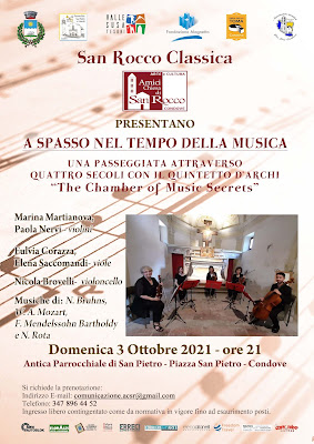 Domenica 3 ottobre, alle ore 21, gli Amici della Chiesa di San Rocco presentano “A spasso nel tempo della musica – Una passeggiata attraverso quattro secoli“, concerto con musiche di N. Bruhns, W.A.Mozart, F. Mendelssohn Bartholdy e N. Rota eseguite dal quintetto d’archi “The Chambers of Music Secrets”: