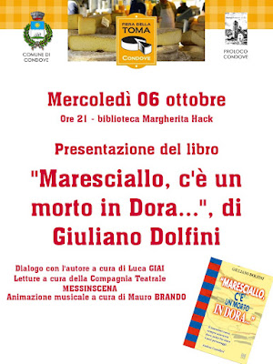 Nell’ambito delle manifestazioni culturali allestite dall’amministrazione comunale e dalla Pro Loco in occasione della XXXI Fiera della Toma, mercoledì 6 ottobre serata alla biblioteca Margherita Hack con la presentazione del libro “Maresciallo c’è un morto in Dora…” del condovese Giuliano Dolfini.