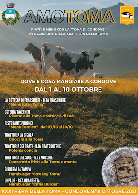 Da venerdì 1 al 10 Ottobre, aspettando la XXXI Edizione della Fiera della Toma e durante i giorni stessi dell’evento, l’iniziativa AMOTOMA raccoglie l’offerta gastronomica condovese che mette al centro la “Toma di Condove”.